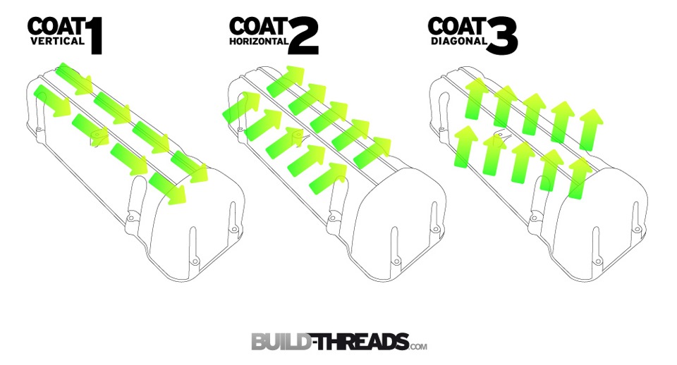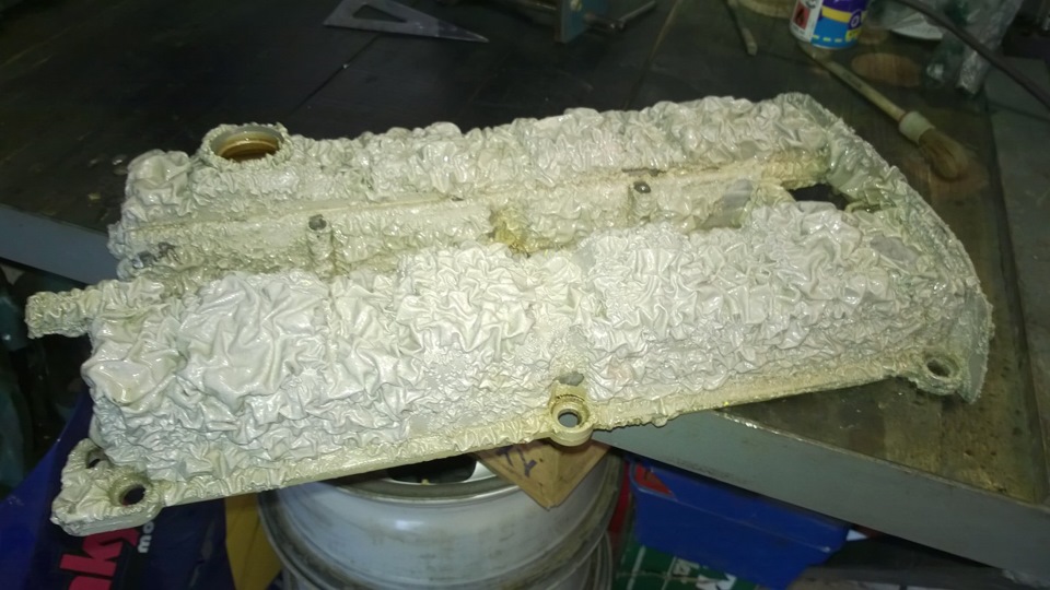 Пока авто активно в починке, выложи пару записей о мелких операциях. Эта запись будет о перекраске клапанной крышки при помощи краски VHT. Краска специальная для КК, похожа на заводское покрытие Ferrari, Lamboghini, Honda и другие "шершавые покрытия". Наносится в минимум 3 толстых слоя, разных направлений. Наносится вдоль, поперек и по диагонали детали. Я наносил по кислотному грунту BODY 960. Ждал 20 минут и наносил краску с интервалом между слоями 5 минут. Время засекал по таймеру. Наносил 4 слоя, и ждал 20 минут, после последнего. Дальше я убрал крышку в коробку с феном на 30 минут с температурой 92 градуса — именно в этот момент появляется шершавость. Собственно самый сложный этап это не покраска а снятие старой краски, для этого лучше использовать густую смывку краски, с феном и болгаркой с мягким кругом (у меня был дремель). На все про все ушло 6 часов. Результатом более чем доволен))
