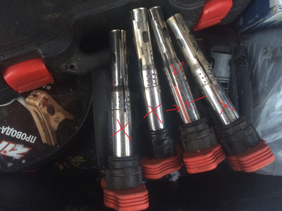 Итог по катушкам значит сделал для себя, но не до конца. Когда такая беда и нету ноута под рукой, меняйте те катушки, которые воняют и нету красной полоски этой. Вот пример, катушки с других цилиндров по бокам, та что с полоской красной это из 6-ого цилиндра, ЖИВАЯ. Наверно. Но эксперементы я не ставил, заменил сразу все катушки на новые дабы не лезть туда вовсе. Оставил живую катушку себе на ВСЯКИЙ СЛУЧАЙ.