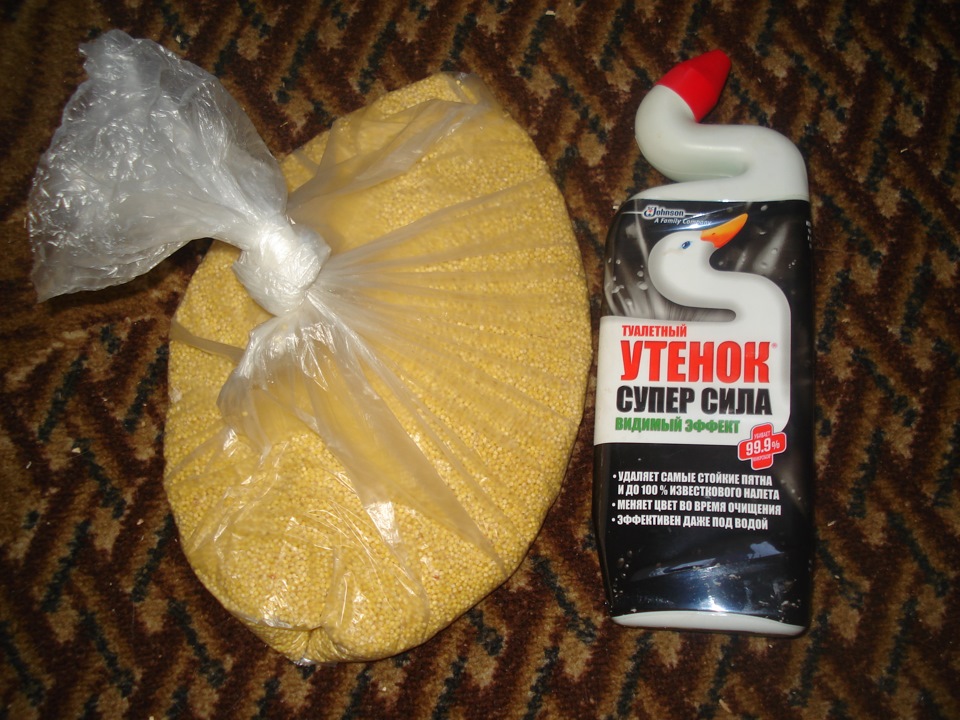 Пока ехал заказ снимал все патрубки и промыл их изнутри остатками Лимонной кислоты. С расширительным бачком дела оказались гораздо хуже, из-за внутренних перегородок не получалось отдраить его до состояния нового. Тогда в ход пошла тяжелая артиллерия… Чем только не пробовал и Кока-Колой, и Фейри с кипятком и мелким песком (запарился искать последний, всю округу обошел) — по нулям. Шумонитом для газовых плит- результата есть но внутри всё равно не промыт. Всю химию жены извел, оставалась дома только зубная паста и средство для унитазов "Утёнок"… И тут наткнулся на пакет с пшеном, короче скрестил все что было под рукой…