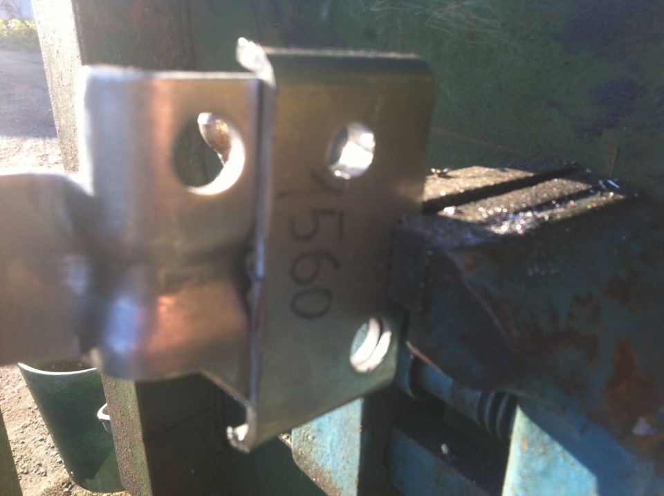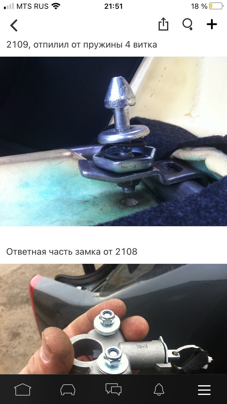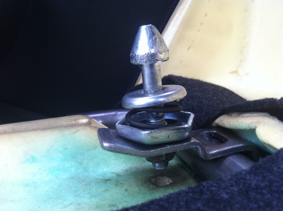 Далее рассверлил квадратики на ушках старого крепления и установил штырь замка капота 2109, отпилил от пружины 4 витка
