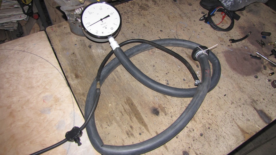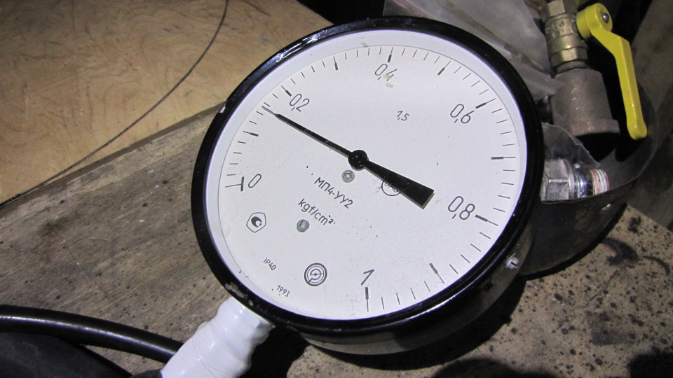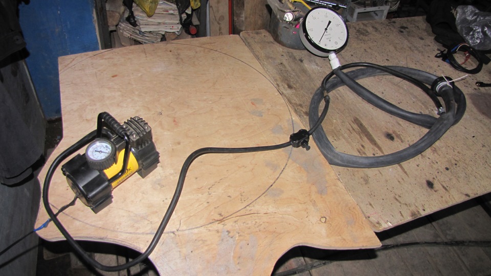 Решил замерить давление открытия (срабатывания) аварийного клапана. В качестве нагнетателя — компрессор КАЧЕК, с заявленной производительностью 40_л/мин. Соединения — велокамерой. Так-же завалялся РЕДЧАЙШИЙ манометр до 1_Атм. (с системы капельного полива промышленных теплиц).
