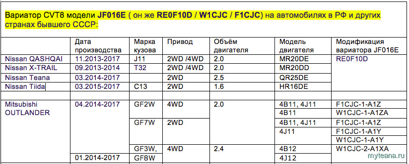 То есть, CVT7 (Jatco JF015E) устанавливался с бензиновыми двигателями объёма 1.5 — 1.6 литра.