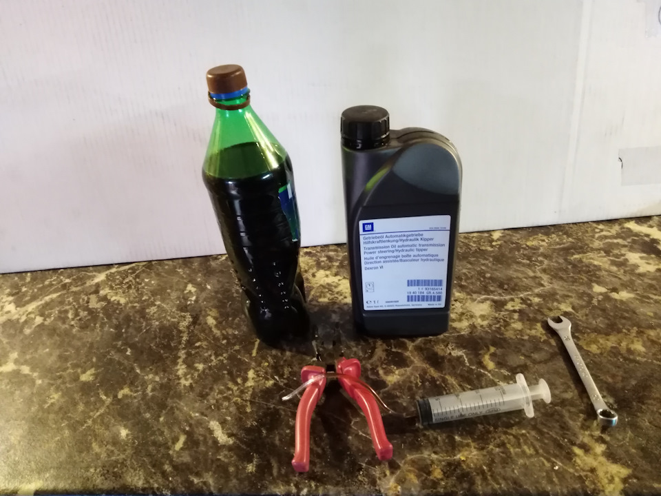 Нам понадобится жидкость ГУР 1 литр (я выбрал Motul ATF 6…номерок для заказа 103217), плоскогубцы, ключ на 10, бутылка пустая и приспособление из шприца с подходящей шлангочкой (можно капельницу использовать).