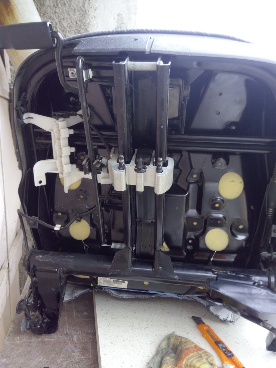 У меня подогрева сидений нет, потому отключать больше нечего. Если вы Богатенький Буратино с "попогрейками", подозреваю, что нужно отключить и их. После этих операций вынимаем сиденье из салона. Далее стандартный набор операций — пылесос в руки и выдраиваем ворс под сиденьем. После этого тряпочка (я использовал с растворителем) и надраиваем до блеска полозья (внутреннюю часть, по которой ходит колесико…)
