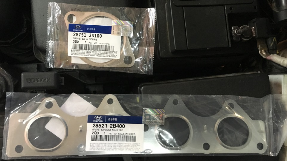 Заказал доставку в сервис и в назначенный день приехал менять штатный коллектор с катализатором на "спортивный" коллектор фирмы MG-Race. Для установки необходимо приобрести две прокладки: одна для соединения коллектора с мотором: 285212B400, вторая для соединения коллектора со штатной выхлопной магистралью: 287513S100.