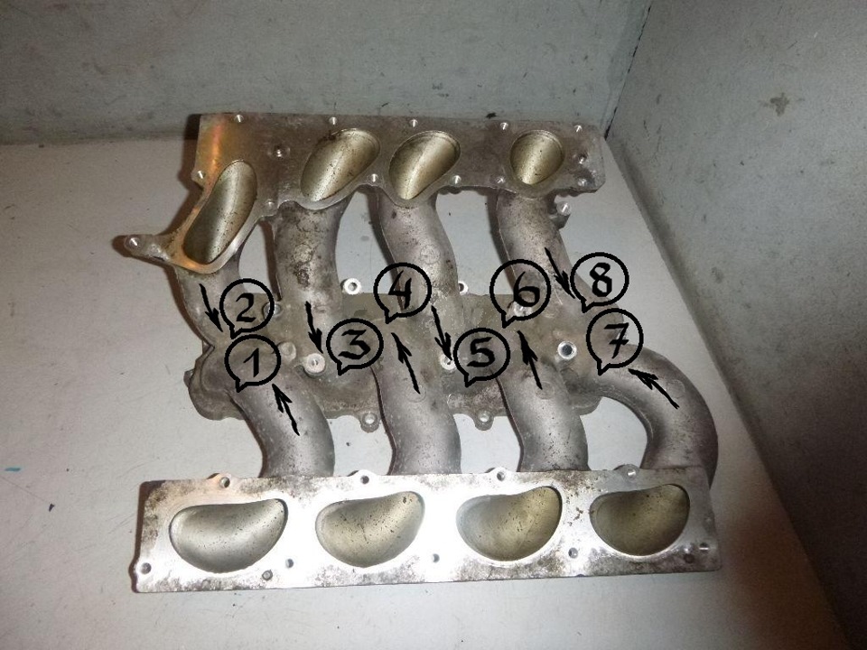 Для того, чтобы предотвратить всасывание воздуха из одной камеры двумя последовательно работающими цилиндрами, нижняя часть впускного коллектора выполнена таким образом, что цилиндры 3, 4, 5, 6 запитываются каналами из камер на противоположных сторонах ресивера.