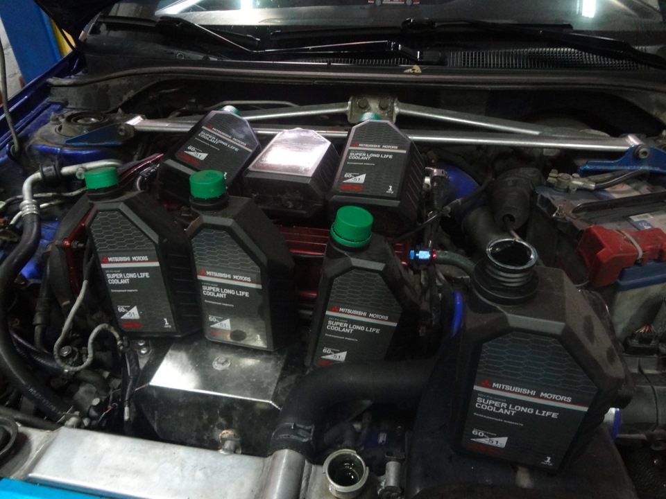 Имея возможность, недорогих цен со склада, я залил оригинальный Mitsubishi (зеленый) антифриз…