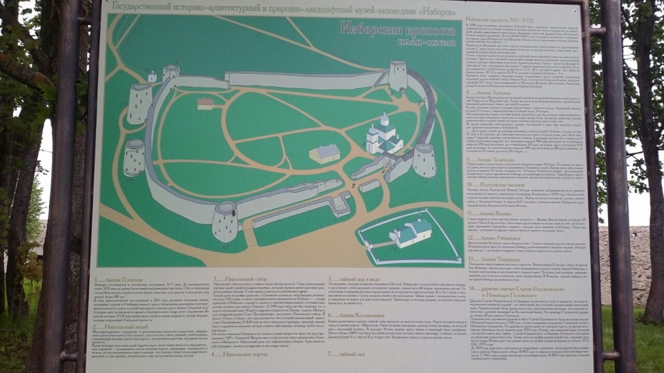 Дальше наш путь лежал в Изборск.Согласно книжной легенде XVII века, Изборск был основан Словеном, сыном Гостомысла, давшим ему имя в честь Избора, сына СловенаПри княгине Ольге (945—960) Изборск стал пригородом Пскова. С X по XIII века о нём нет известий. Известия о городе становятся частыми с 1233 в связи с нападениями немецких рыцарей. Войны с орденом продолжаются около трёх столетий, до начала XVI века. Частые осады и пожары, сопровождавшие нападения рыцарей, заставляли жителей не раз переселяться с одного места на другое. В 1330 году Избореск был построен на новом месте посадником Селогой вместе с псковичами и изборянами на Жеравьей горе и с того времени до XV века новая крепость выдержала восемь осад. Борьбой с крестоносцами Изборск заслужил славу оплота Земли Псковской и Новгородской, даже враги называли его «железным городом».В 1510 Изборск вместе с Псковом присоединён к Московскому княжеству. Во время осады Пскова (1581) Изборск был занят Речью Посполитой, однако по Ям-Запольскому миру (1582) возвращён Москве.В 1708 году Изборск был приписан к Ингерманландской губернии (в 1710 переименована в Санкт-Петербургскую губернию). С 1719 года — уездный город Псковской провинции Санкт-Петербургской губернии, с 1777 — заштатный безуездный город Псковской губернии.В 1920 по Тартускому мирному договору между РСФСР и Эстонской республикой Изборск перешёл к Эстонии, стал частью уезда Петсеримаа (эст. Petserimaa) и административным центром волости Ирбоска (она же Изборская волость, эст. Irboska vald), преобразованной в 1939-м году в волость Линнузе (эст. Linnuse vald). После присоединения Эстонии к СССР в 1940 году посёлок оставался в пределах административных границ Эстонской ССР.С августа 1941 по август 1944 года был оккупирован нацистской Германией (административно подчинялся Рейхскомиссариату Остланд).В январе 1945 был передан Псковской области РСФСР.В настоящее время туристический центр. Государственный историко-культурный и природно-ландшафтный музей-заповедник (с 1996 года).16 января 1996 года постановлением Правительства РФ был создан Государственный историко-архитектурный и природно-ландшафтный музей-заповедник «Изборск» с территорией 7734 га. Первым директором музея-заповедника был Леонид Николаевич Панов.