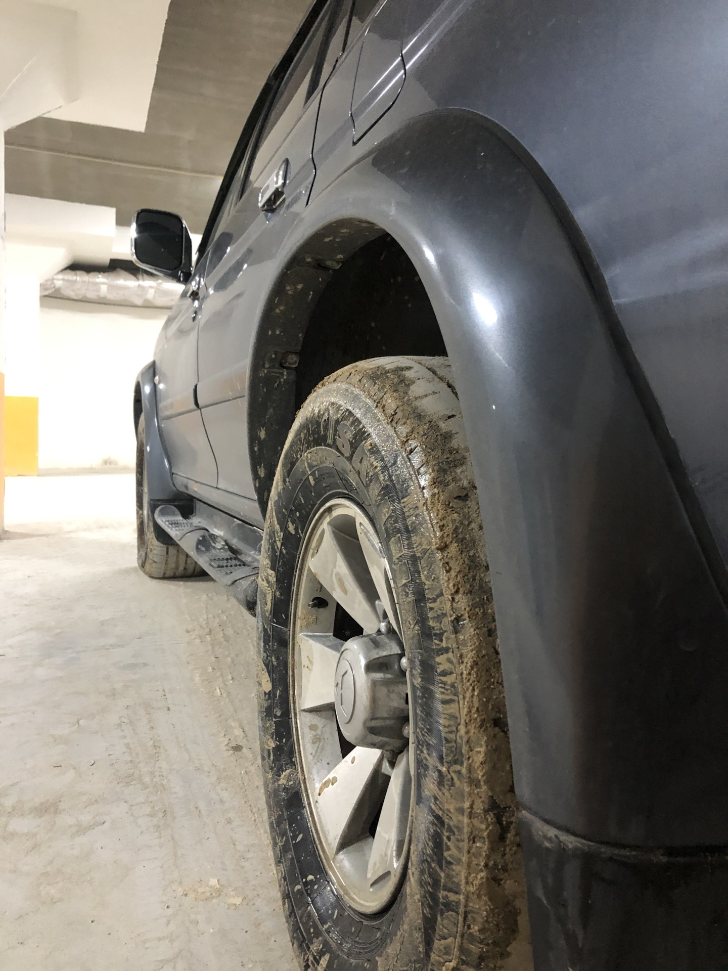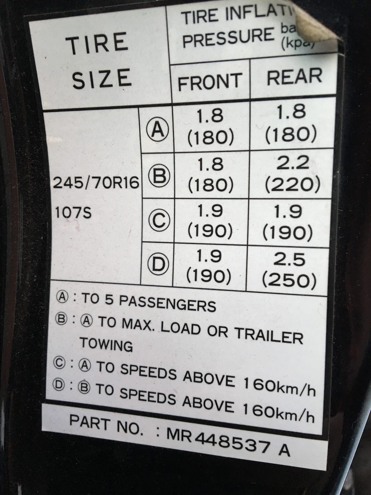 На пробеге машины 61400км (25.11.2015 ) проведена "переобувка" в BFGoodrich All Terrain T/A LT 255/70 R16 115S OWL вместе с первой ихней установочной балансировкой . Исходная глубина протектора на новых шинах составляет +-13мм, как по боках, так и посредине дорожки шины. После изучения инета, мануалов, своих наблюдений на старой резине и т.п., давление в шинах решил держать, и держу все таки, как рекомендует завод изготовитель МПСа (как гласит наклейка на средней стойке дверного проема водительской двери), передние колеса 1,8 бар, задние 1,9 бар (проверяю правильным манометром — это важно!) .