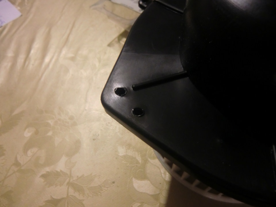 Для его монтажа необходимо проделать по 3 отверстия под монтажные направляющие и под саморезы которыми вентилятор крепится к корпусу отопителя. Я эти отверстия продела обычным паяльником.