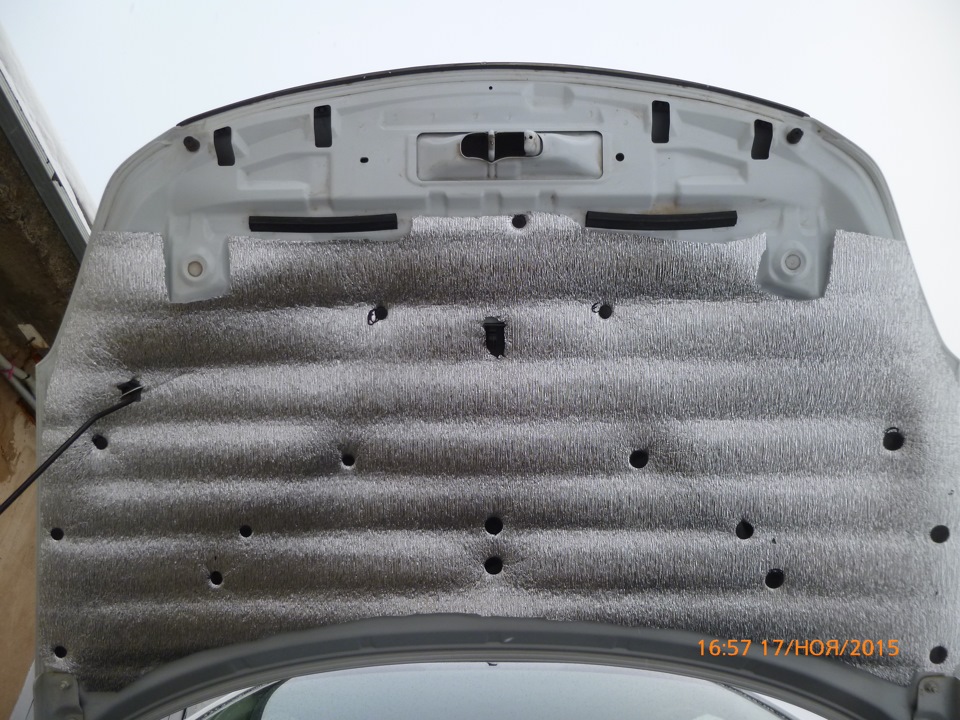 рёбра жёсткости по идее должны быть подклеены к полотну капота, производитель сэкономил.(по центру пластиковый держатель стойки капота так и не смог снять только расшатал его)если не связать, со временем может появится дребезжание.связал виброй.обезжирил и как следует прикатал.