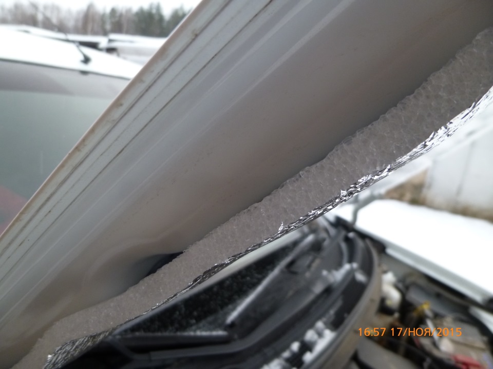 обычный изолон толщину не помню, прошлой зимой был в половиу тонше и просто лежал на двигателе, тоже тепло держал, привод педали газа быстро сделал в нём дыру.поэтому нынче решил его пистонами прикрепить…двигатель стал меньше рычать.