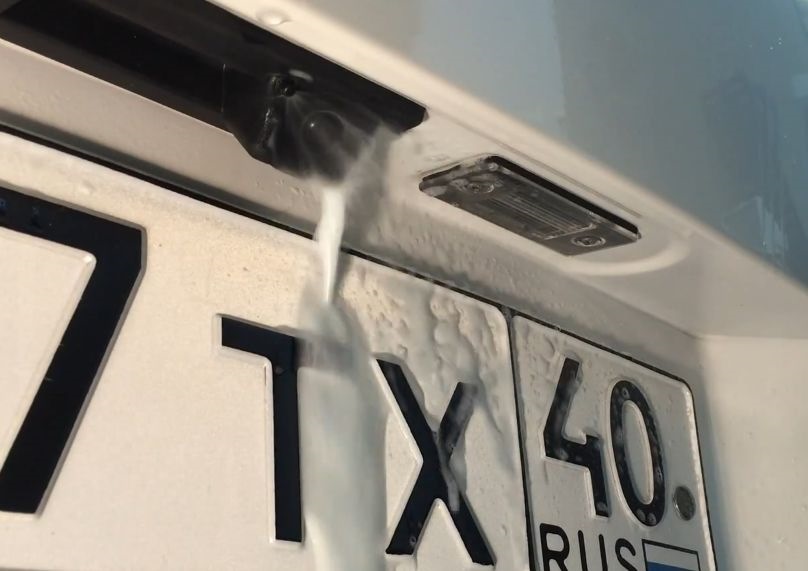 После установки камеры заднего вида, да еще и с блоком нанесения траекторий на изображения, радовался конечно, но после первой же поездки стало ясно, что чистым глаз камеры остается совсем не долго. И возвращаясь на стоянку, экран ГУ показывал чаще "молоко", чем реальное изображение сзади, особенно в грязные погоды. Поэтому очень хотелось заколхозить омыватель камеры, например как здесь, который очень соблазнял, но дальнейшее сверление железа отбивало желание.
