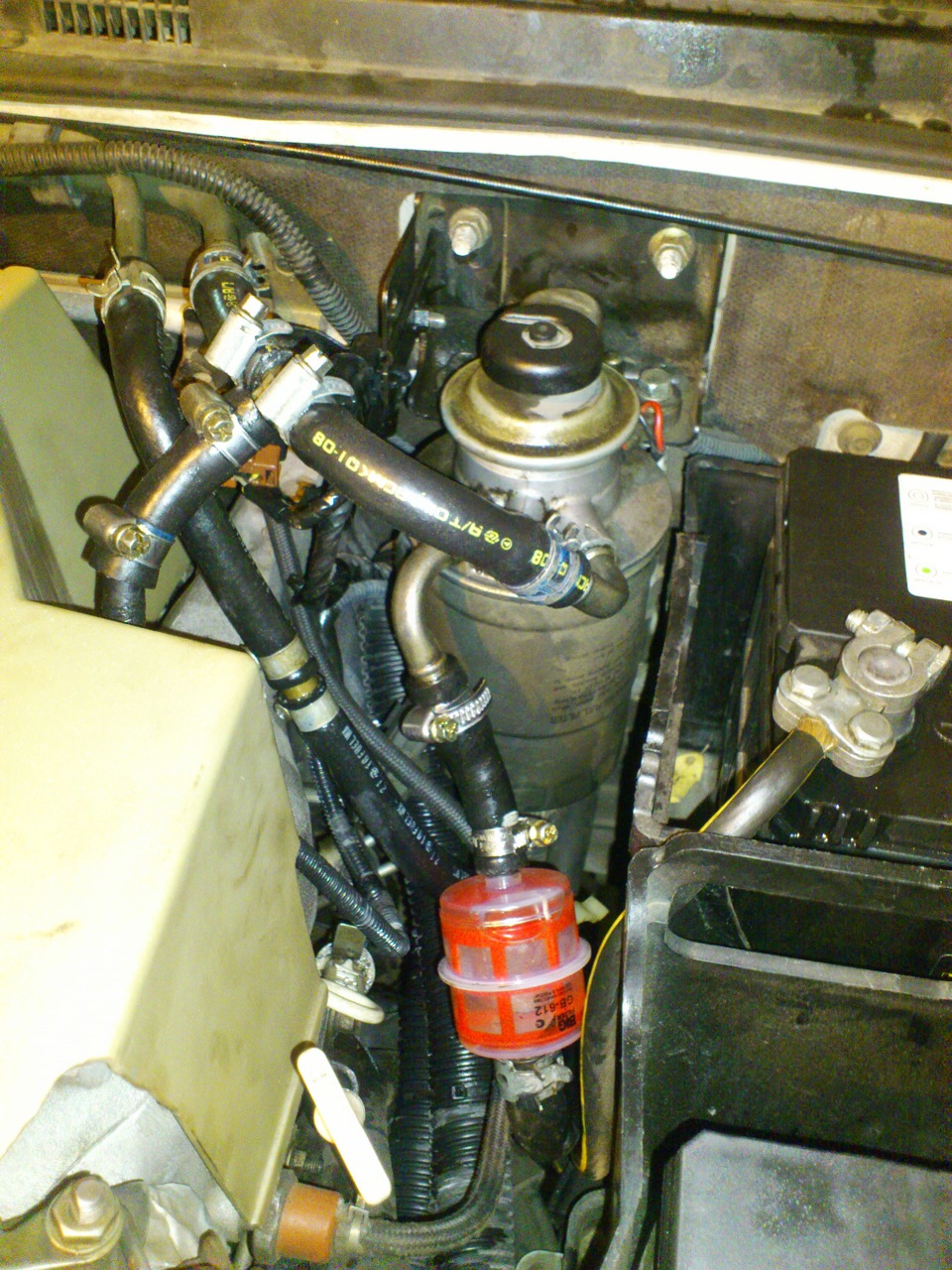 И поставил я доп.фильтр GB-612, хотел установить перед основным фильтром, но меня уговорили поставить после основного мотивируя тем что: ЦИТИРУЮ если ставить перед основным, то фильтрик может забиться водой и замёрзнуть( А если после! то основной задерживает воду, и если даже вода замерзнет то соляра будет проходить т.к объём в фильтре большой, и если датчик фильтра не сработает то доп.фильтр страхует также страхует и от основного фильтра! при замени фильтра (нового) не качественного( мелкие частицы или волокна от фильтра могут пройти в тнвд а доп фильтр подстраховывает.