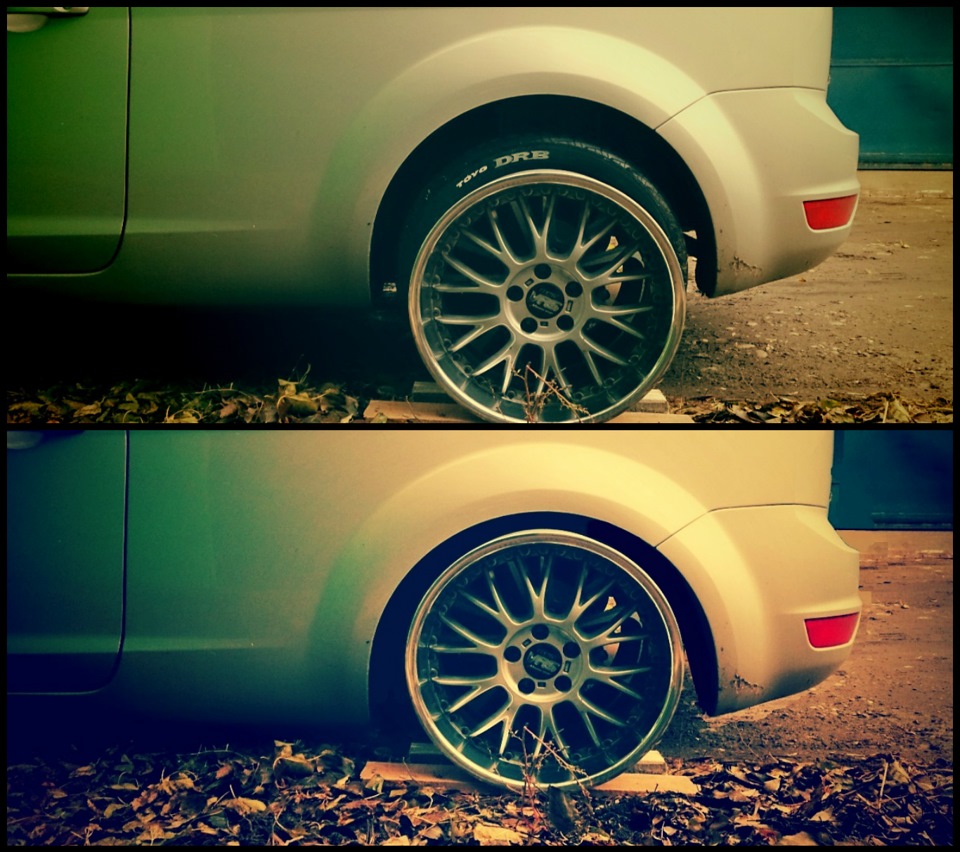 Тебе не гоняться на нём, а ездить в удовольствие — поэтому для стиля советую -50 посадку и резину красивую типа Ёки Парады или V102, Вредика 60 (Сесанта), Нитто NT555, … ;)