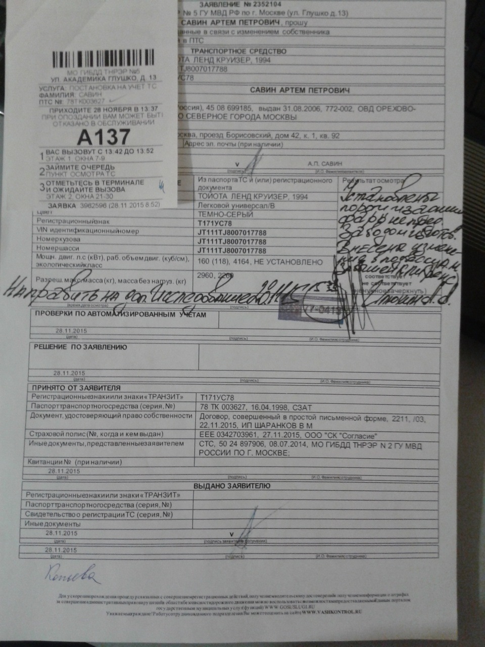 1. Докопались, что вин залит антикоркой. Его видно, видно, что он выбит в раме, но, со слов инспектора, он должен быть зачищен до металла. Что в таком случае вин тупо сгниёт, его не волнует, мол, мажьте литолом. Назначили мне экспертизу, завтра туда поеду. Как я понимаю, тут подводных камней нет, эксперт посмотрит с умным видом, сотфкает и будет 20 дней писать бумагу с печатью о том, что это не верблюд, а ТЛК80. Тачка точно легальная 100%.
