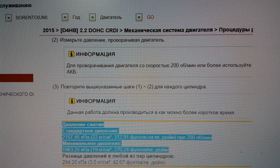 Кто то утверждал, что компрессия у нашего мотора должна быть не менее 30 бар. Откуда у них такая инфа хз . У предидущего Соренто BL с мотором D4CB может и должна быть под 30 очков, но на нашем Соренто XM который с мотором D4HB стандартное давление сжатия оно же компрессия 22 кг/см2, тоже самое и в Барах 22 бар. или 2157,45 кПа, ну либо в америкосовском исчислении 312,91 фунтов /кВ. дюйм.