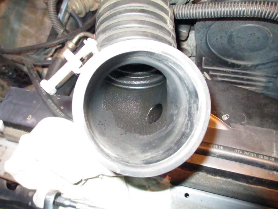 Традиционно любой ремонт начинаю со снятия АКБ, затем воздушного фильтра. Так, что видно: трубка вентиляции картерных газов вся в масле, маслоуловитель почти полный. Сама турбина без люфтов, но залита маслом, похоже из трубки вентиляции. Далее снимаю впускной патрубок, который перед дроссельной заслонкой, масло.