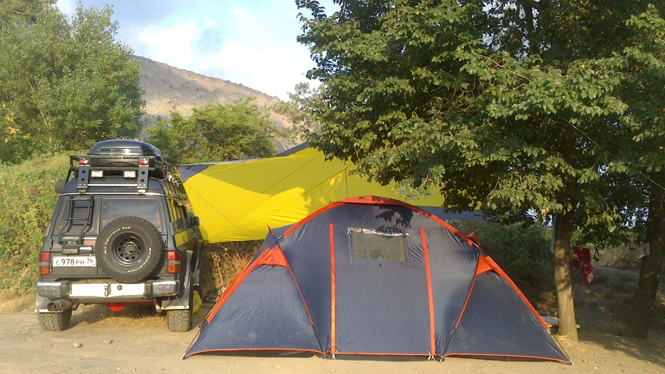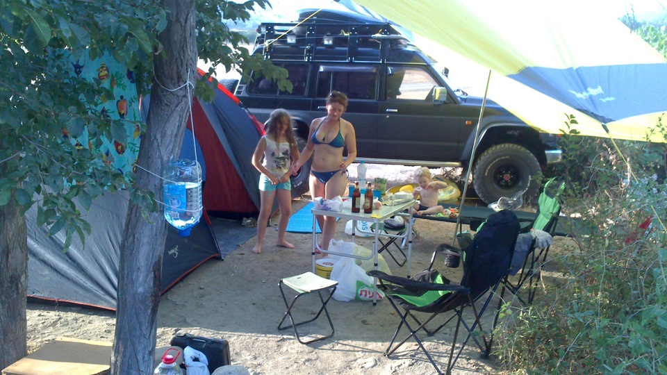 Следующим, по плану, была стоянка с палаткой на побережье, поэтому поехали искать место. Точнее я его ранее по дороге уже присмотрел. В районе посёлка Морское у санатория Солнечный камень. Нашли хорошее место, на удивление оказалось свободным. До моря 100 метров, за пригорком в 10 метрах горная речка, где можно набрать воды для умывания, охладить продукты.