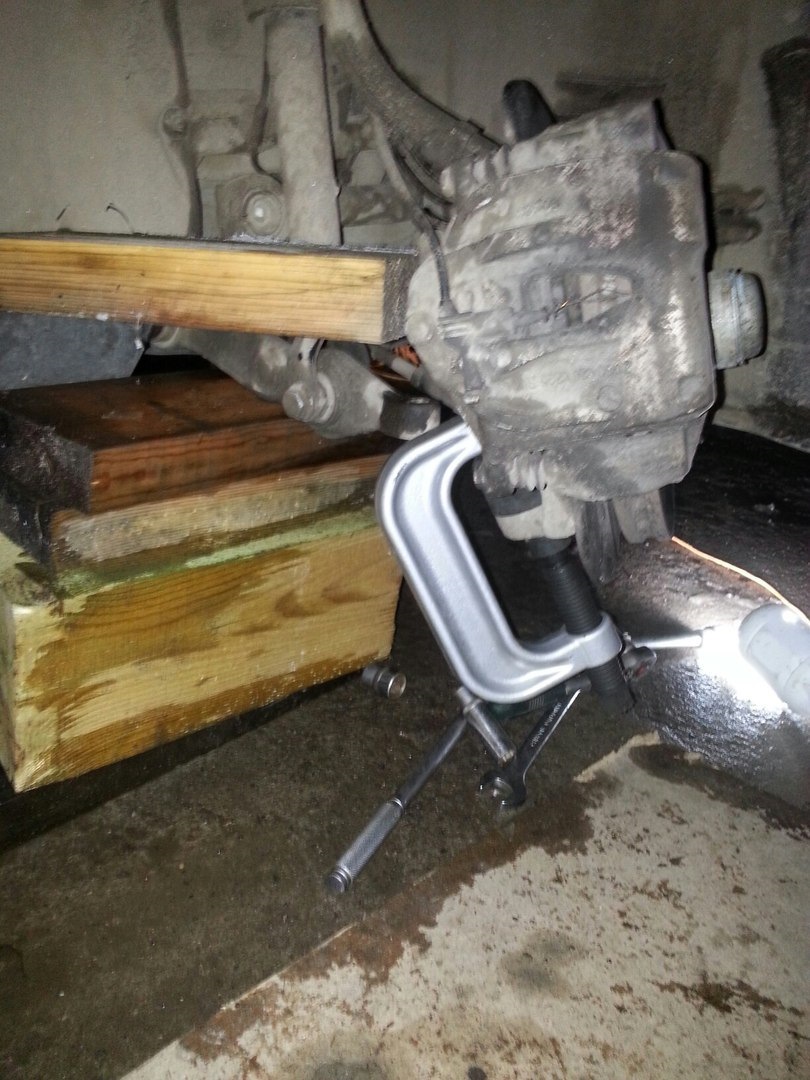 Подкладываем дощечки (можно чтонибудь другое) под рычаг и опускаем авто до состояния чтоб вес авто был на дощечке.