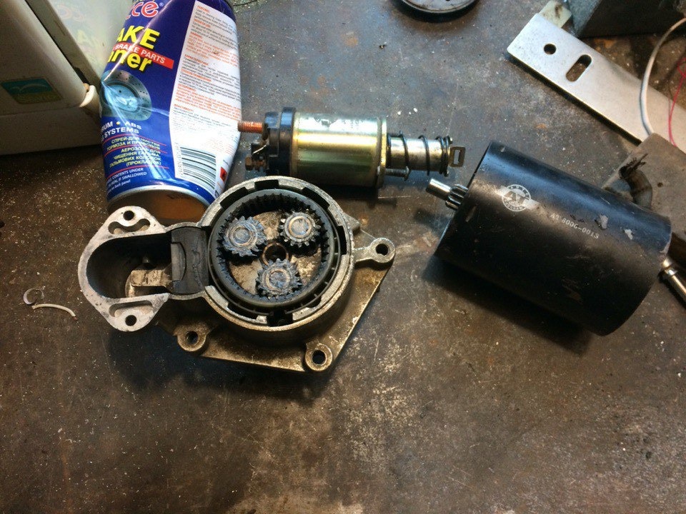 разобрал втягивающее, там когда то смазано было, сейчас там довольно тягучая масса, всё повытерал, что б было сухо, посмотрел на это всё, вроде надо бы дальше разбирать, но так не охота, думаю сейчас как разкручу, разлетятся детали во все стороны и я его уже не соберу… батя то ещё до разборки начал говорить что наверное там уже всё, наверное что то износилось и нужен новый стартер, это ж китай как никак… ну взял разобрал таки его, не так всё и страшно) там пару деталей всего оказывается)) смазка в редукторе вообще никакая, она уже высохла совсем… короче говоря взял повытирал всё, где бендикс ездит всё промыл с балончика для чистки тормозов (классная штука кстати! он вымывает что угодно, даже без прилогания усилий, просто смыл и всё) бендикс начал ездить куда веселее, уже под своим весом болтается туда-сюда, ну в редуктор не чего помазать густого, туда ж литола или шруса не намажешь, потом весь стартер в нем будет, по этому намазал тем что было, а самое густое был циатим, вот его немного мазнул и собрал обратно