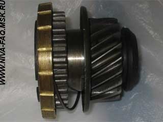 начинаю собирать, ставлю шестерню на втор вал — а она что то не хочет, втулка не садится и всё! шлицы проходит, а дальше не идет((( снимаю шестерню, а то не удобно, беру саму втулку пытаюсь одеть — нифига… ну ёптЫ! я третий раз покупаю эту самую шестерню и ещё НИ ОДНОЙ не было нормальной! все откровенный брак! хоть какой то размер из всех прое не соответствует… ну что делать, беру втулку от этой шестерни что провернуло, она ка раз под новую шестерню подошла, на удивление не люфтит как было с одной прошлой шестерней, вынужден ставить её… так что поставил шестерню с старой втулкой, а новую вон сверху одел показать до куда она еле-еле налазит, дальше никак…