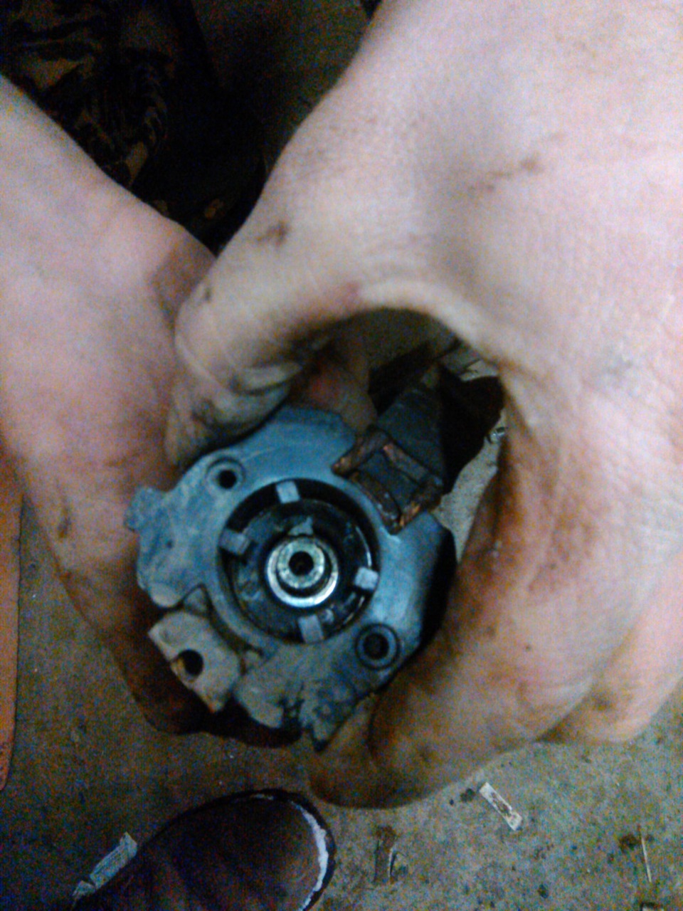 Еще день прошел… Заезжаю вечером в Гараж. Собираем стартер. Блин, ну все теже 4 лишних детальки. Руслан, как более опытный воин в битвах со Стартерами — решил что они "от старого втягивающего" и плевать на них. Смазали раствором масла с литолом. Подключили для пробы к Аккумулятору. …ять! Клац мля клац а ни хрена не крутит!.. Пришел Мишган. перевернул втягивающее вокруг продольной оси на 180градусов. Заработало! Ура! Хотя хрена ли "ура"… Стекло то до сих пор — так и не установлено… Вот такая вот загогулина…