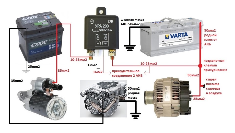 Я пустил новую массу сечением 10мм2 от места прикуривания к упомянутой выше точке на моторе, и то через соединение на второй АКБ: