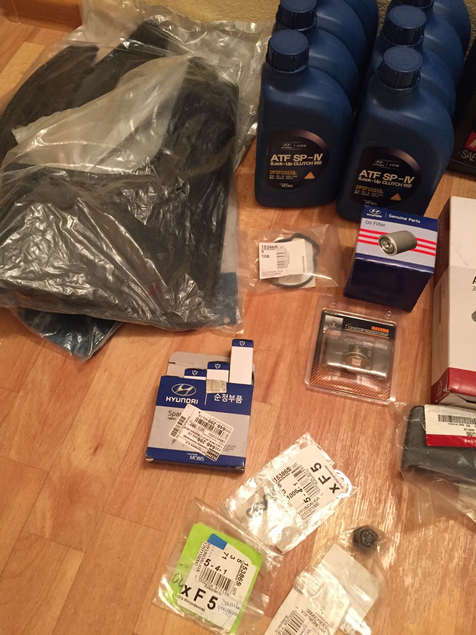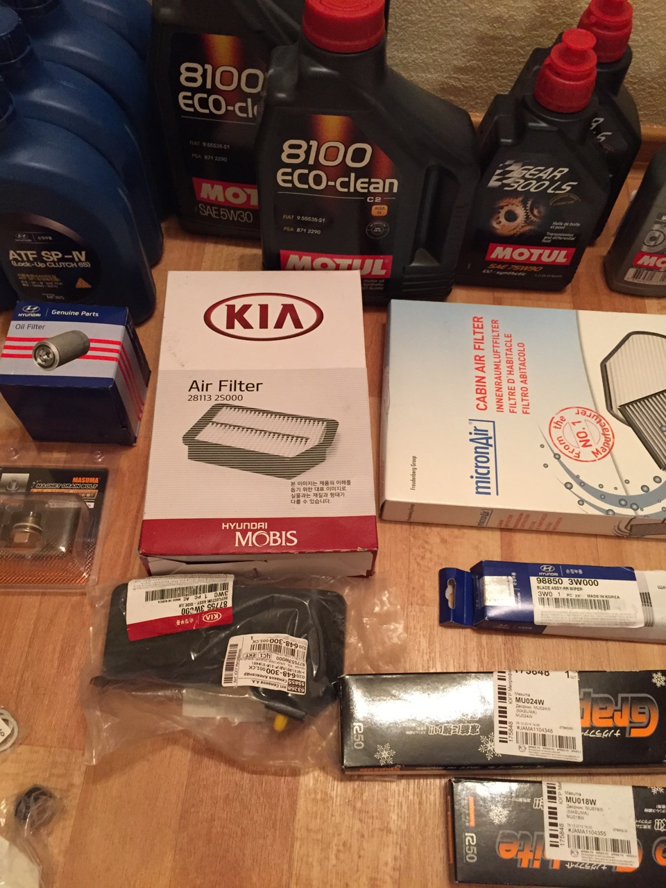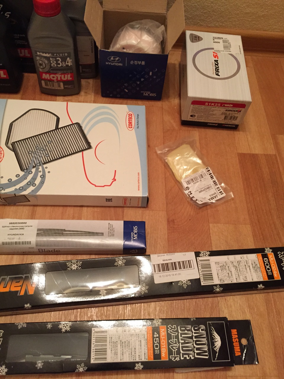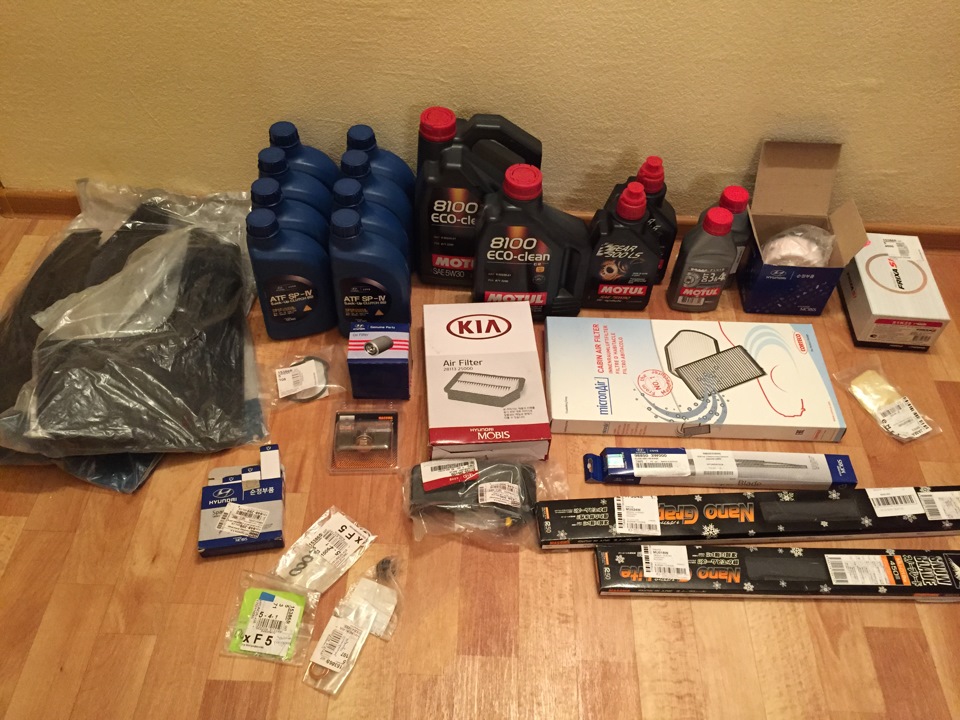 Все фильтра, все масла. Тормозуха, колодки передние, диски скоро придут, свечи, куча прокладок сливных и заливных горловин. Брызговики на перед и зад, крутые щетки масума)