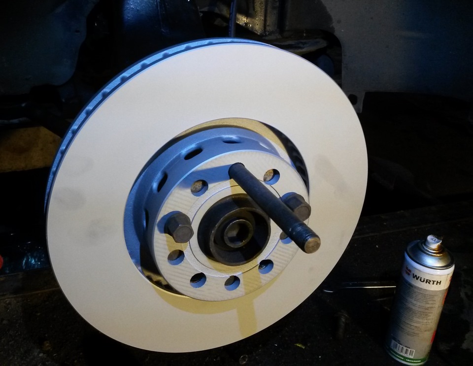 Можно сразу прочистить резьбу крепления суппорта к кулаку, об этом подробнее чуть ниже. Брызгаем ступицу медной смазкой, поверх нее ставим новый тормозной диск ATE 24.0130-0104.1 размером 314х30 мм (аналог VAG 441 615 301 AA) и прикручиваем его парой колесных болтов.