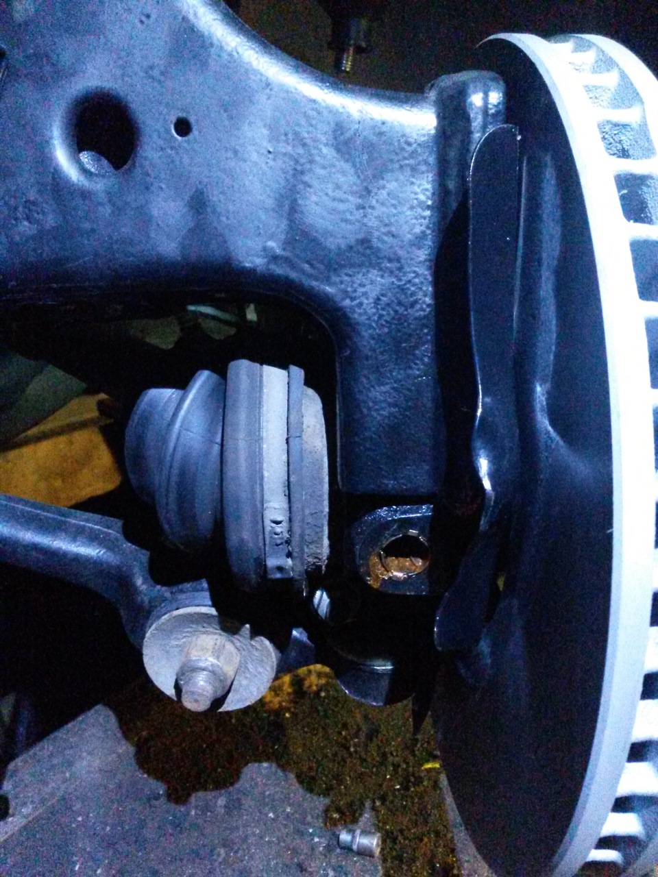 Теперь можно снимать суппорт и временно вешать его на крюк, либо на рулевую тягу, либо на скобу которая держит нижнюю часть крыла. Выворачивается стойка наружу, и откручиваются два болта VAG N 907 085 02 которые его крепят. Болты там правильные, под гаечный ключ или головку, с ними проблем никогда не было, не то что сзади :)