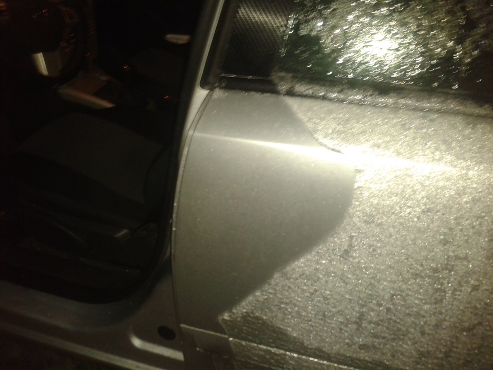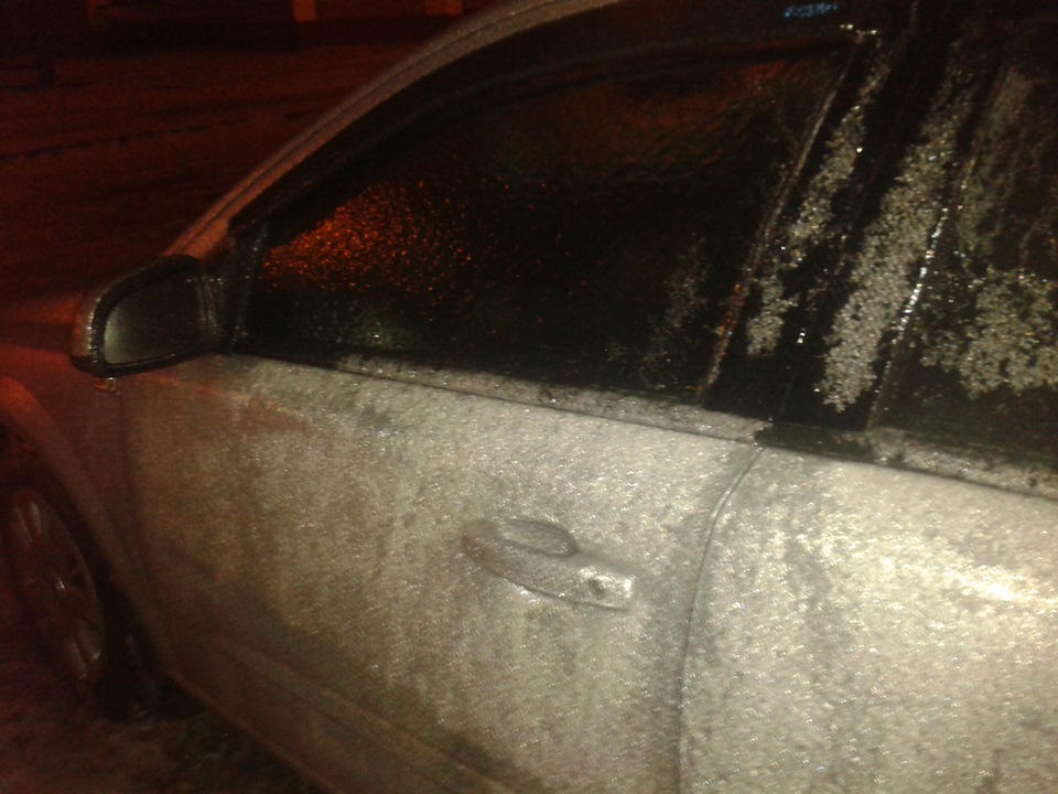 Толщина корки льда на машине состовляла 1,5 см. Три пятилитровых бутылки горячей воды помогли открыть одну дверь, остальное открывал по мере прогрева машины. Кстати, кто заморачивался с кнопкой отключения ESP, тронуться на голом льду очень сложно, тормоза душат колеса и на малых оборотах глохнет двигатель.