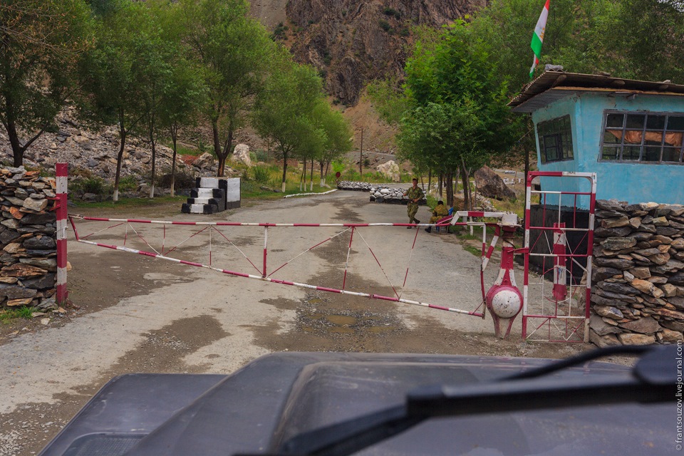 6. Решаем вернуться на перевал Хабуробад (или Хобуработ, как правильнее было бы называть), чтобы отснять его с высоты. На посту у нас в очередной раз переписывают данные паспортов — "регистрация". Обратите внимание на оригинальное устройство шлагбаума.