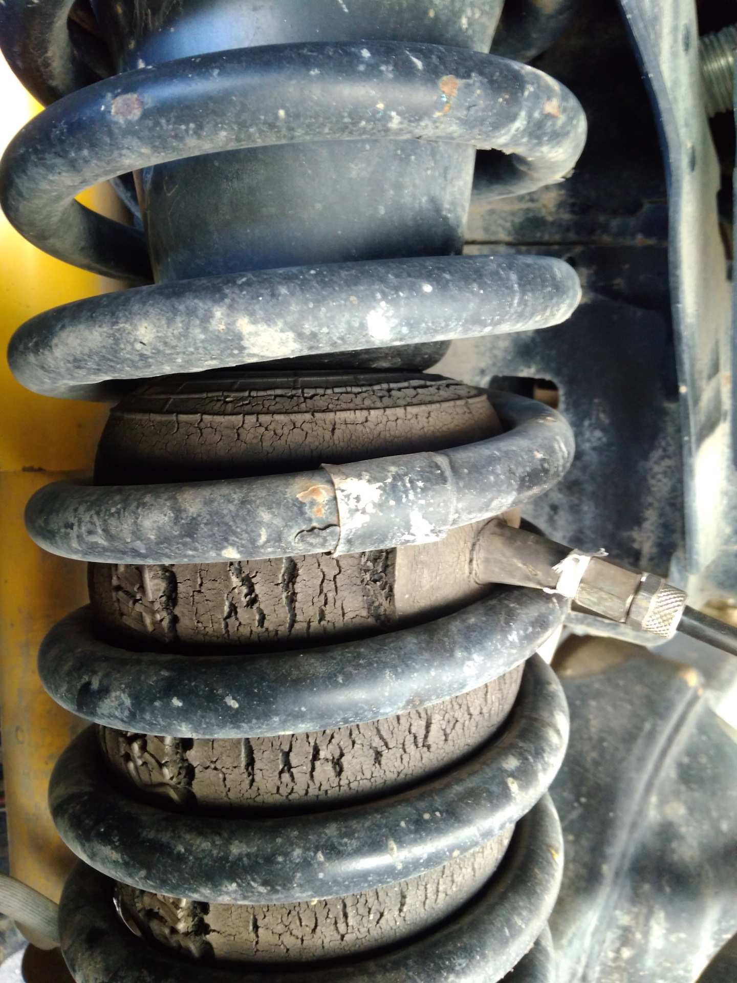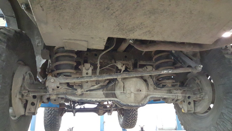 Кто-что советовал…, кто — поставить проставки с одной стороны, кто-то говорил что пружины просели. Пружины нормально так денег стоят, и покупать новые чисто для проверки (сейчас стоять OME + 4") — не хотелось, тем более сам считаю, что дело не в них, а в том что третий бак стоит чуть влево на 130 литров + АКБ, родной бак слева . Установили пневмобаллоны на заднюю ось. Регулировка изменение расстояние от рамы до моста на 3 см. Жопу задирать не планирую, но там бак на 130л, спальник, шмурдяк… считаю, что не зря.