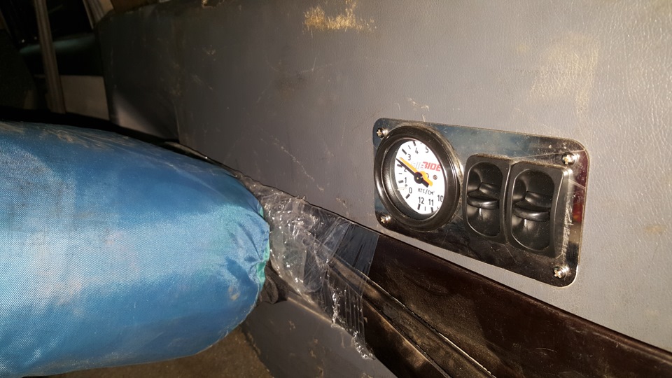 Изначально в баллонах стоял нипель — переделали под зажимной фитинг. Управление подкачкой и стравливанием поставили в багажнике, там же двухстрелочный манометр с подсветкой.