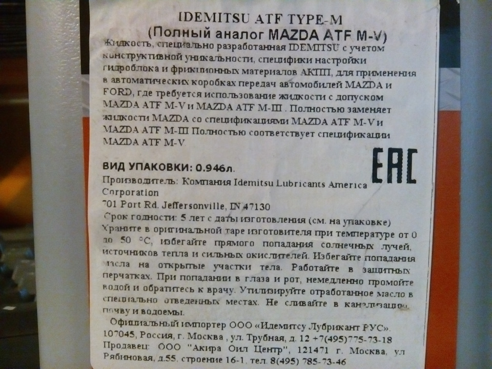 При этом — в линейке фирменных масен IDEMITSU — есть масло ATF TYPE-M ( IDEMITSU 10113-042P) — в аннотации к которому — прямо на этикетке — написано — что это — специальная формула, разработанная для МАЗДЫ и является аналогом спецификации М5. Производитель и завод — тотже.(Американский завод в Джефферсонвиль)