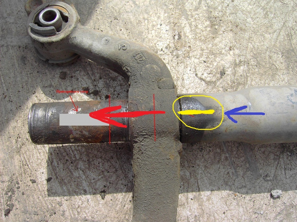 Делаем надпил на балке (см. рис 1), отмеченный желтым, на рабочую часть пальца (по которой ходит подшипник) привариваем нашу ненужную железку, и начинаем колотить по рычагу, выбивая его вместе с пальцем из балки, по направлению красной стрелки.