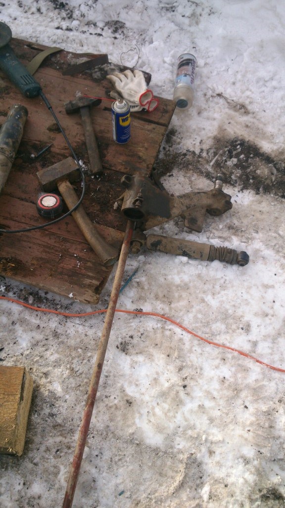 Снимаем амортизаторы и убираем их в сторону, обязательно измеряем расстояние от рычага до кузова, чтобы при сборке не промахнутся торсионом и не поднять/опустить попу.