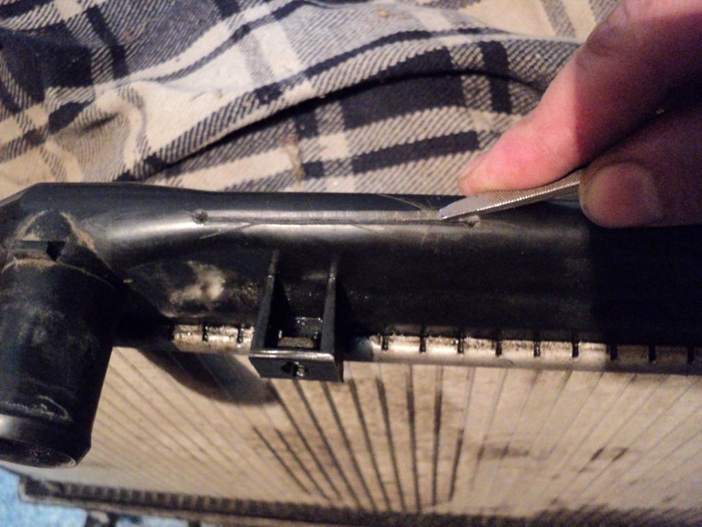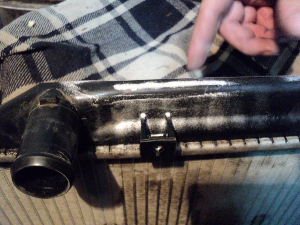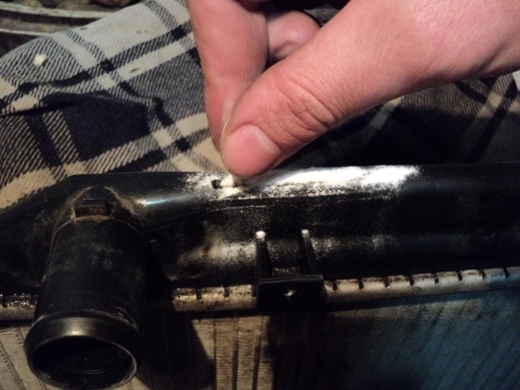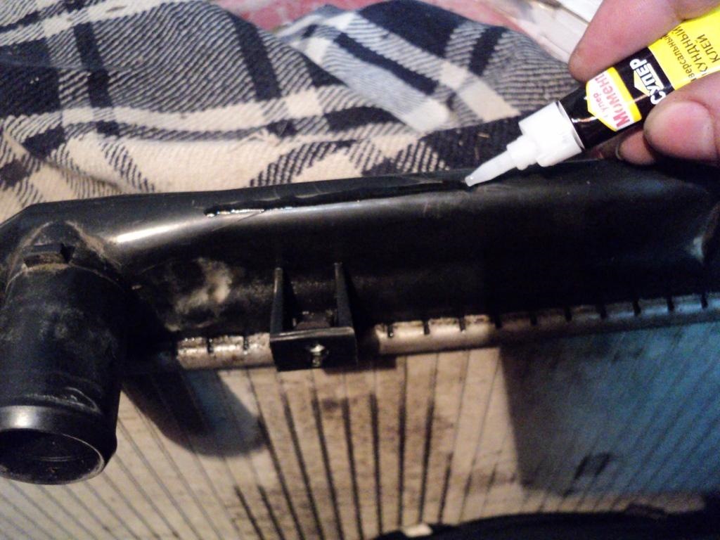 Получил аванс и поехал за продуктами. Заехал в магазин, чувствую запах горелого в салоне, явно из печки тянет, капот открыл, там пена по радиатору и пар… Первые мысли были: "Всё, пи**ц приехали… у меня радиатор лопнул". Купил дистиллят долил, врубил печку на максимум и вернулся домой. Кое-как его выдрал с машины, перед этим слив странную жижу с песком… Сижу думаю чем бы запаять? На youtube.com есть ролики (youtu.be/_Pi5_juNfeQ и youtu.be/xXlaZNCG8H4), как ребята заклеивают трещины смесью: супер клей + коагулянт или заваривают электродами трещину. У меня есть теплопистолет и ABS электроды, но я так понимаю надо не ABS, а PA66 электроды, которых у меня нет.