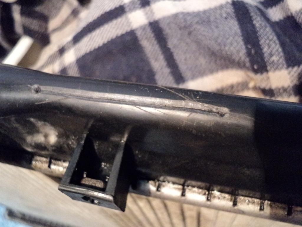 Так как с пластиком уже работать умею, то решил сделать по-аналогии: засверлил края трещины, углубил и расширил края трещины надфилем, придав им вид конуса; залил супер-клеем и посыпал содой. Довел количество слоёв клея с содой до 3 и оставил сохнуть.