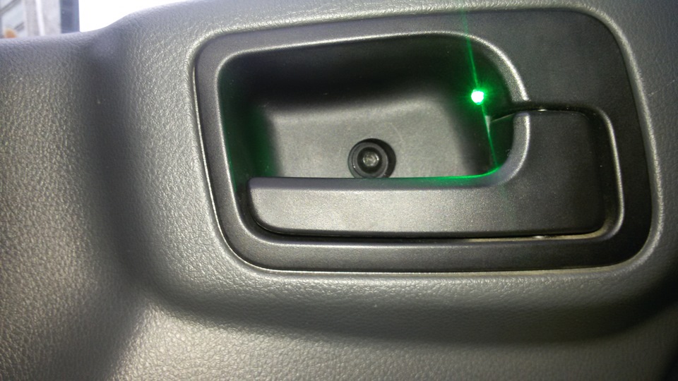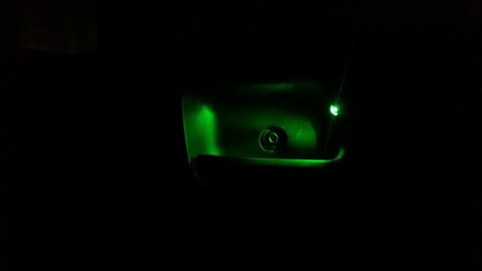 Сейчас чаще темно на улице чем светло. И клиенты выходя из машины вечно не могут найти ручку открывания. Решил поставить диодик зелёный (всё в цвет) и подцепил его на подсветку кнопок стеклоподьёмника.