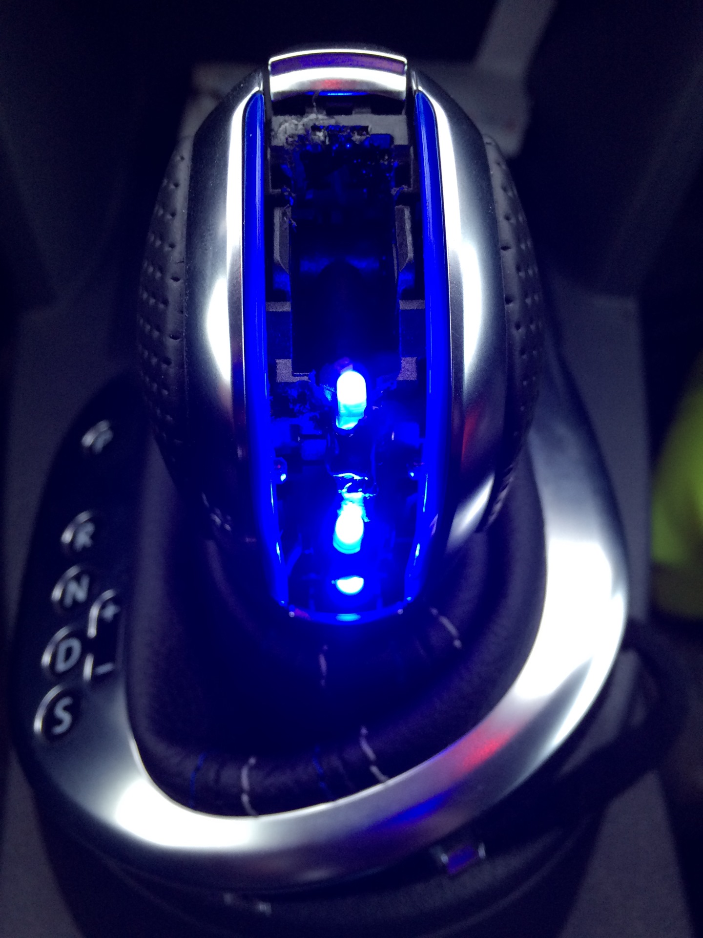 Сегодня расскажу о очередной доработке ручки переключения DSG. После предыдущей доработки ДОРАБОТКА не давала мне спокойно спать мысль о подсветке синих вставок в ручке от GOLF 7 GTE. Также был перешит чехол ручки и ручника, а также были перетянуты боковинки ручки перфорированной кожей. В этот раз швы делал один синий другой бежевый. Получилось супер. Матовую кожу мастер подобрал хорошую как я его и просил. Пошив на высоком уровне. Чехол ручника поменял за 5 мин. а вот с чехлом DSG пришлось повозиться, тем более что нужно было вживить подсветку синих вставок. Методом подбора мест диодов понял что нужно 3 синих диода, чтобы светило равномерно. Припаял к диодам сопротивления на 1 кОм и проводки. Диоды приклеивал горячим клеем, ни куда не денутся. Подсветку запитывал от подсветки прикуривателя, он оказался довольно близко. На другом конце сделал разъём для лёгкого снятия ручки DSG ( так сказать на будущее, мало ли что в голову стрельнет :). ) всё устанавливаем ручку на своё место. Радуемся проделанной работе. Результатом доволен на все 100%.