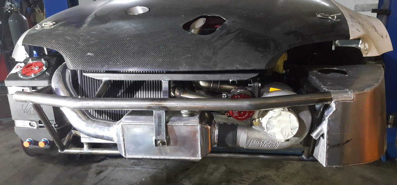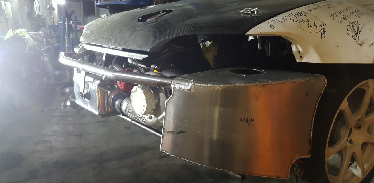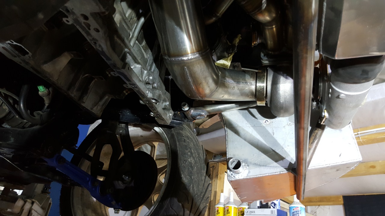 Даунпайп вышел таким. Выход с турбины 76мм, далее в гибе идет расширение до 102мм. Выпуск достаточно длинный, что очень хорошо. Две фото ниже — это вид снизу.