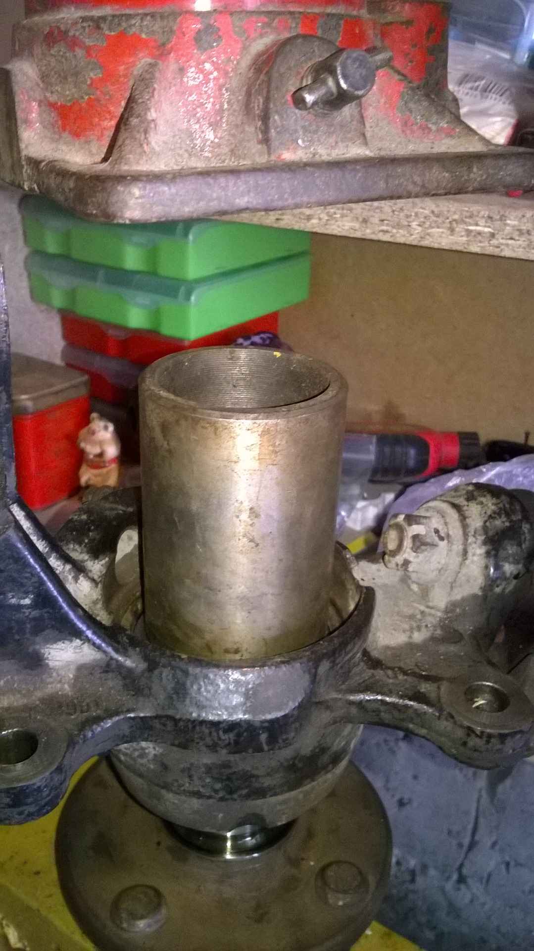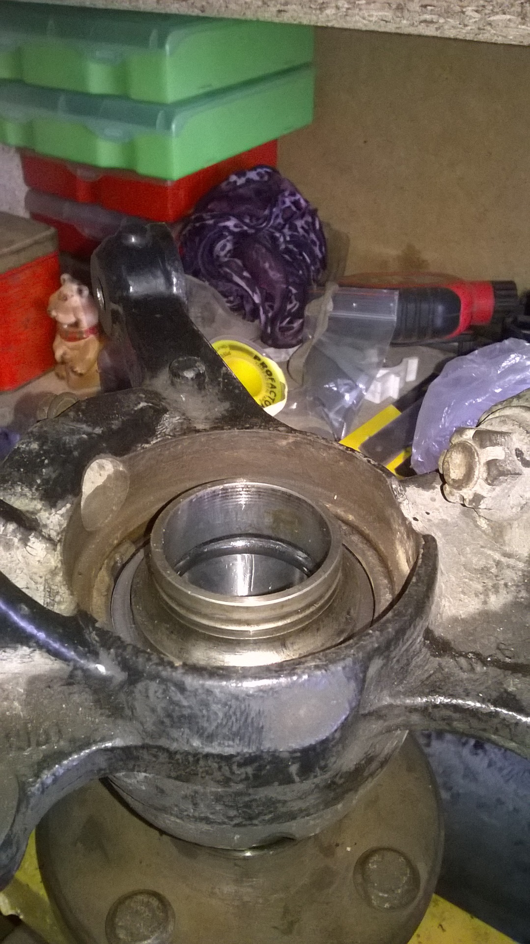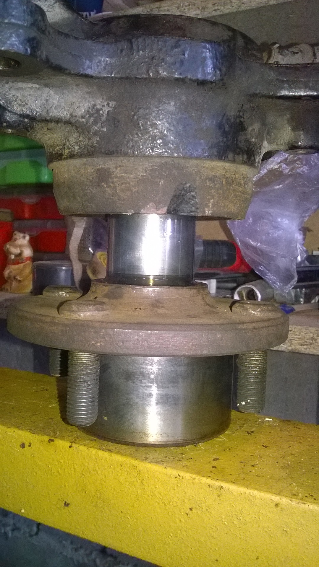 Делаем пирог – обойма старого подшипника, ступица, поворотный кулак с запрессованным подшипником, внутренняя обойма старого подшипника, кусок трубы. Запрессовываем.