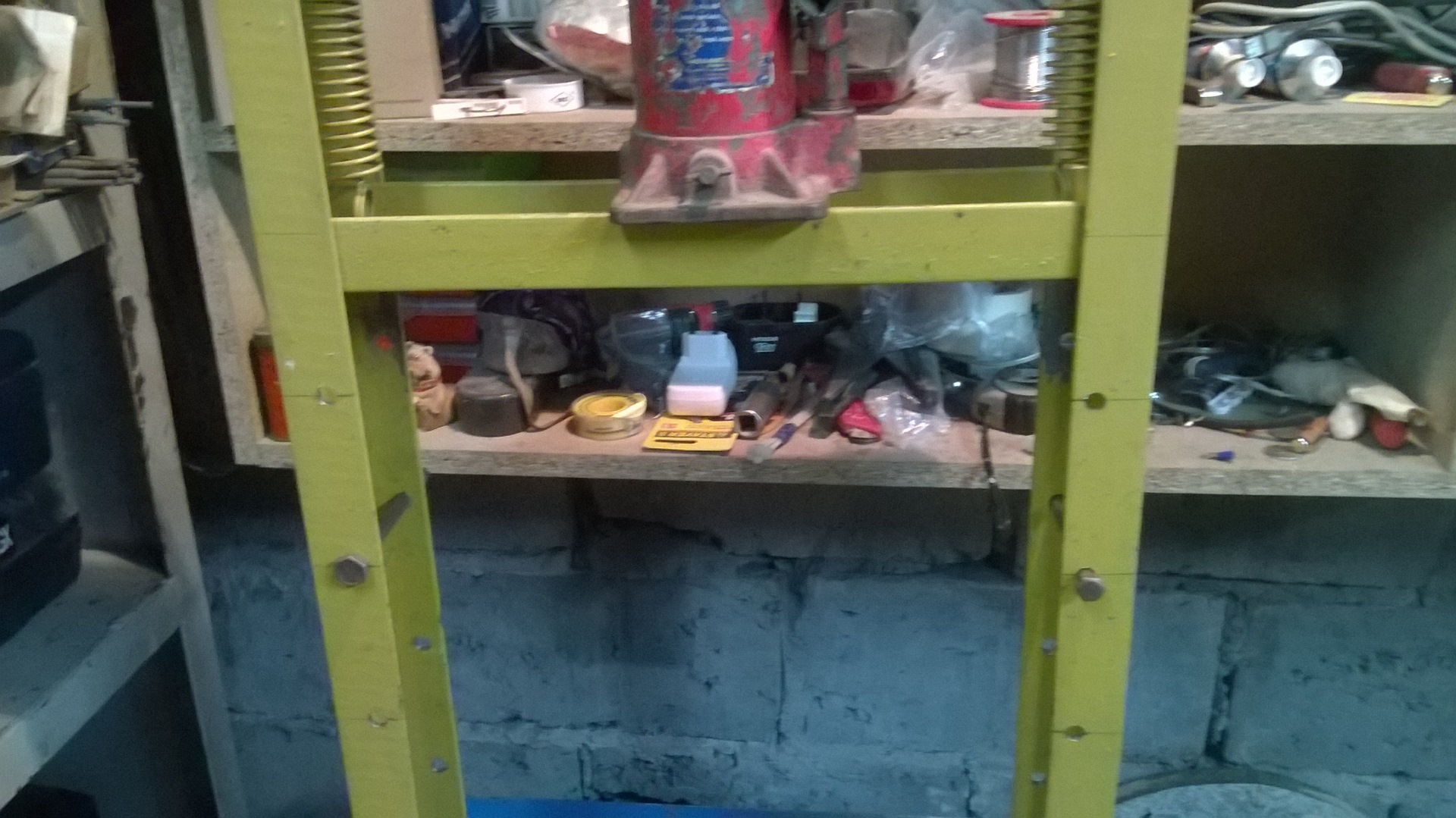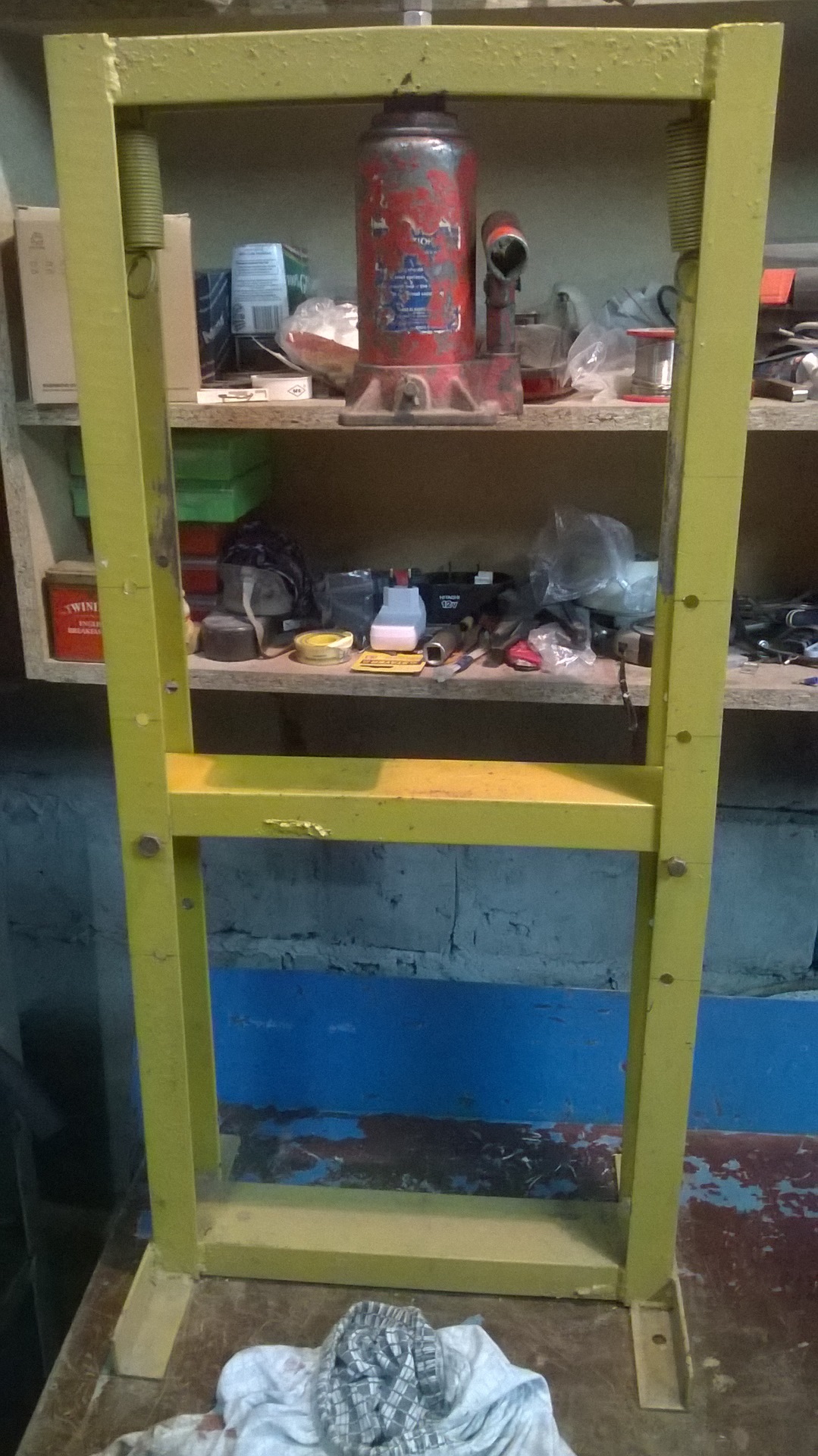 Пару лет назад я собрал гидро-прес для отжима яблочного сока. Немного его доработал, просверлил отверстие и нарезал резьбу на винте домкрата. Прикрутил к каркасу преса. Сделал регулировочные отверстия высоты столика.