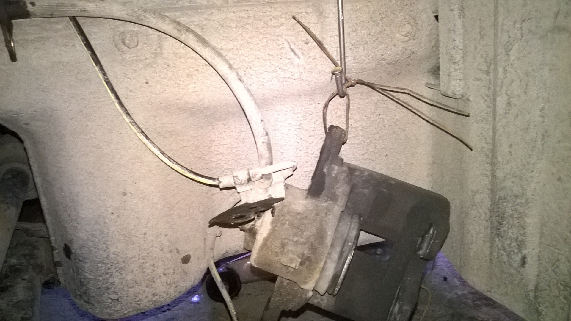 Открутил ступичную гайку, снял тормозной цилиндр, суппорт, диск, отсоединил от стойки стойку стабилизатора, снял датчик АБС, крепеж тормозной трубки.