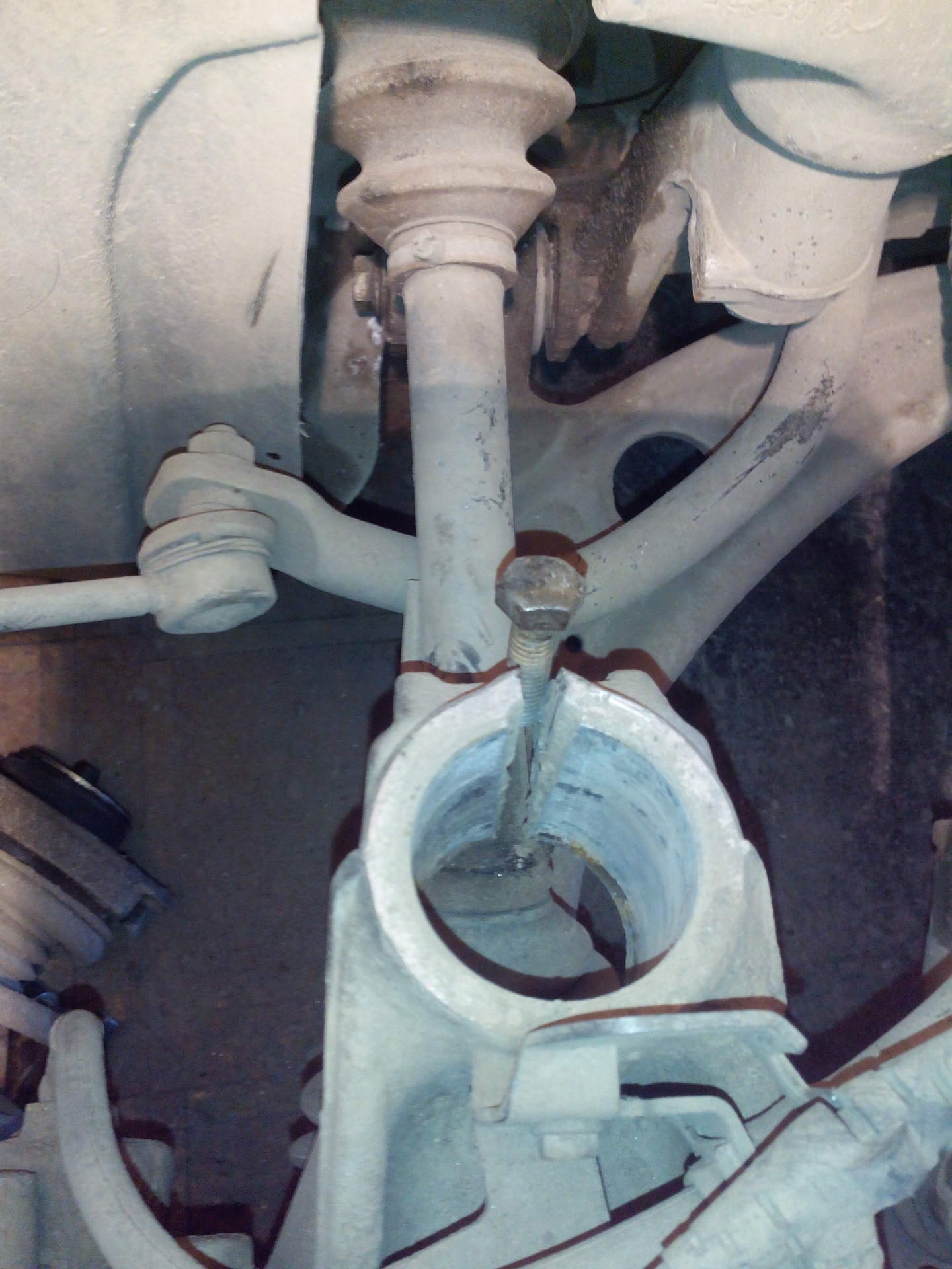 И опускаем домкрат.Чтобы вытащить аморт из кулака, необходимо разклинить его обжим, для этого заточил под зубило болт М 10 и забил в "щель"