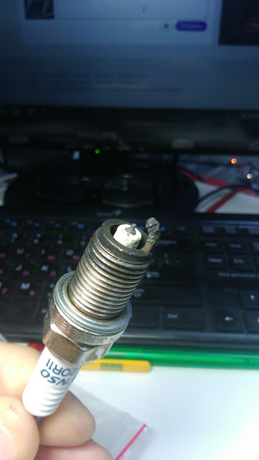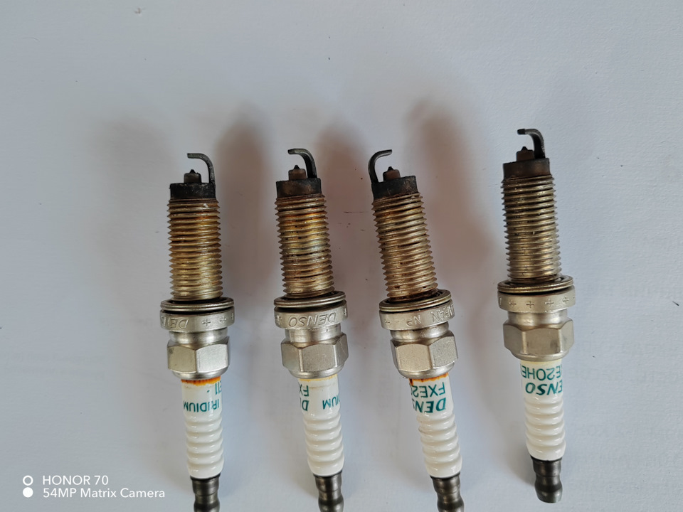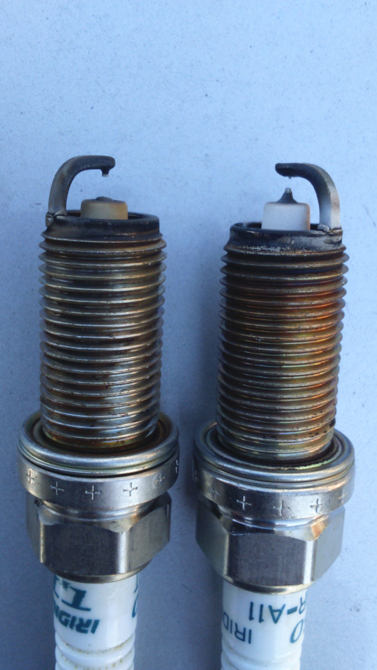 На работе дали нам денсо, вот результат после 30000 пробега .рядом родная тойотовская после 220000 пробега.