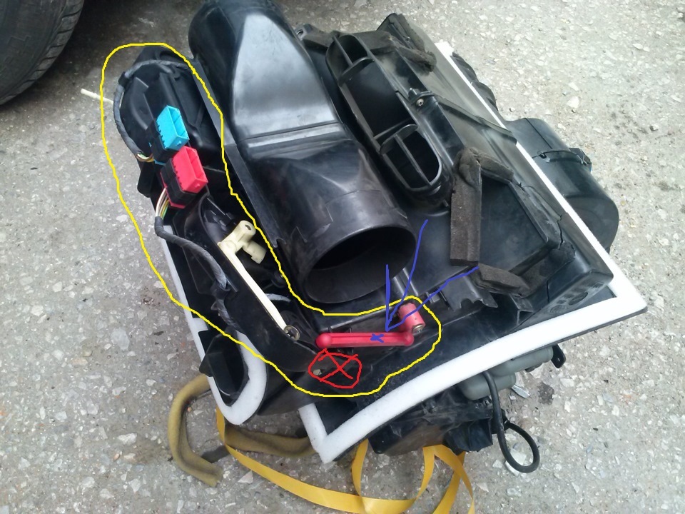 сервоприводы, которые расположены на одной панели (обведена желтым) были откручены в местах обозначенных красным крестом, т.е тупо не были прикручены и держались на одних только тягах (показано синим). Сразу в голове возник вопрос как это все могло работать не выдавая ошибок. Я и раньше замечал что воздух порой шел не туда куда ему было предназначено. но как то не уделял особого внимания, в целом все работало достойно.