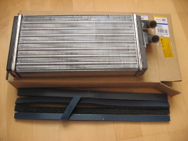 В душе были сомнения по поводу радиатора печки, хоть мой и грел нормально (стояла какая то ерунда китайская) но все же больше разбирать отопитель мне не хотелось, уж очень много времени занимает. я принял решение заменить еще и радиатор. Брал исключительно оригинал Hella Behr Service 8FH 351 311-621